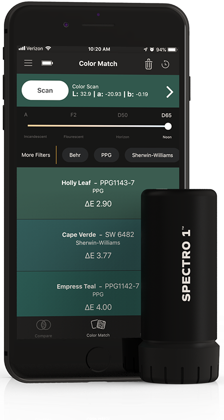 App-compatible and cloud-backed, Spectro 1 uses patented and patent-pending technology to deliver convenient, efficient, and exact color matching. This extremely intelligent device is small enough to fit in your pocket, but has capabilities on par with spectrophotometers that cost thousands of dollars.
